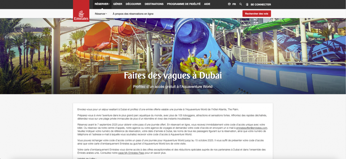 - Réservez rapidement : Prenez un billet aller-retour sur emirates.com pour un départ avant le 8 octobre 2025. Toutes les classes (Éco, Business, Première) sont éligibles.