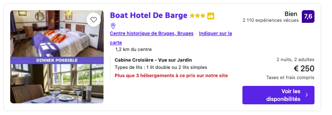 Le Boat Hotel de Barge, à 62.5 €/nuit/personne, est un hotel insolite qui offre une vue sur les canaux pour observer l’eau depuis votre chambre cosy.