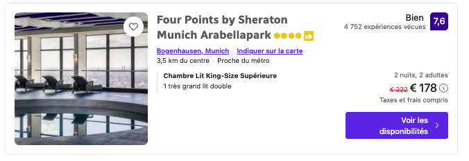 Le Four Points by Sheraton Munich Arabellapark (44,5€/nuit/personne) offre un confort moderne avec une touche d’élégance, parfait pour explorer les chalets de Noël tout en profitant d’une vue apaisante sur Munich. 🍻