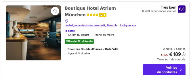 Le Boutique Hotel Atrium München (47,25€/nuit/personne) séduit par son ambiance chaleureuse et son emplacement central, à deux pas des marchés festifs, pour un séjour cosy au cœur de l’hiver bavarois. 🎅
