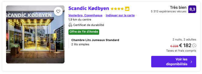 Le Scandic Kødbyen (45,5€/nuit/personne) vous immerge dans le quartier trendy de Vesterbro, à deux pas du marché de Noël de Tivoli, parfait pour vibrer au rythme du hygge danois et des lumières festives. 🎄