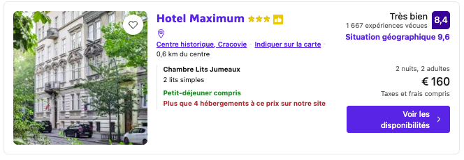 L’Hotel Maximum (40€/nuit/personne) vous place au cœur de la vieille ville, à deux pas du marché de Noël de la Rynek Główny, idéal pour plonger dans la magie polonaise et savourer des oscypek fumants sous les flocons. 🎄