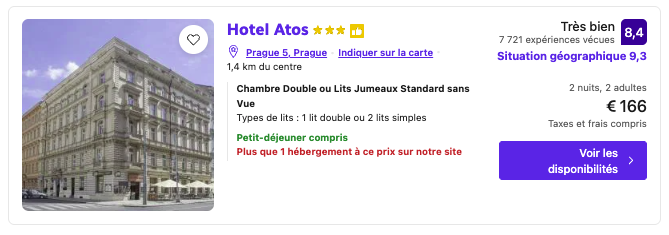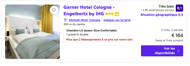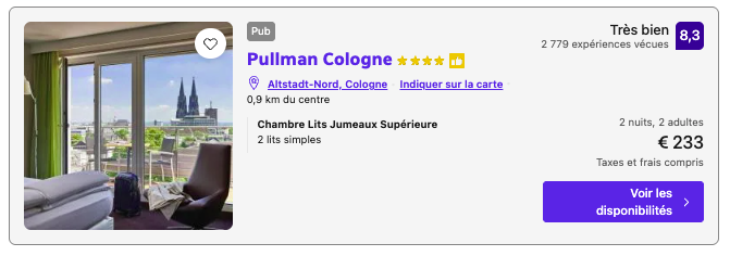 L’Hotel Cerise Strasbourg, autour de 71€/nuit/personne, séduit par son design contemporain et son prix étant le moins cher des environs.