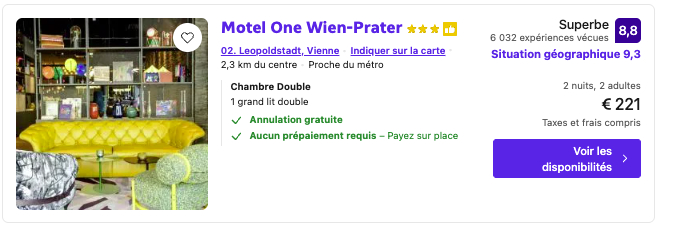 Le Motel One Wien-Prater, autour de 55,25€/nuit/personne, offre un classique viennois pour un séjour théâtral et élégant.