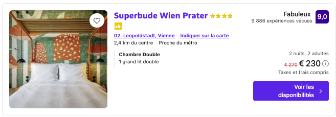 Le Superbude Wien Prater, à 57,5€/nuit/personne, est près du palais avec un luxe accessible qui enchante.