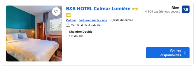 Le B&B HOTEL Colmar Lumière à 75 €/nuit/personne, est confortable avec parking gratuit, idéal si vous préférez une touche d’aventure routière.