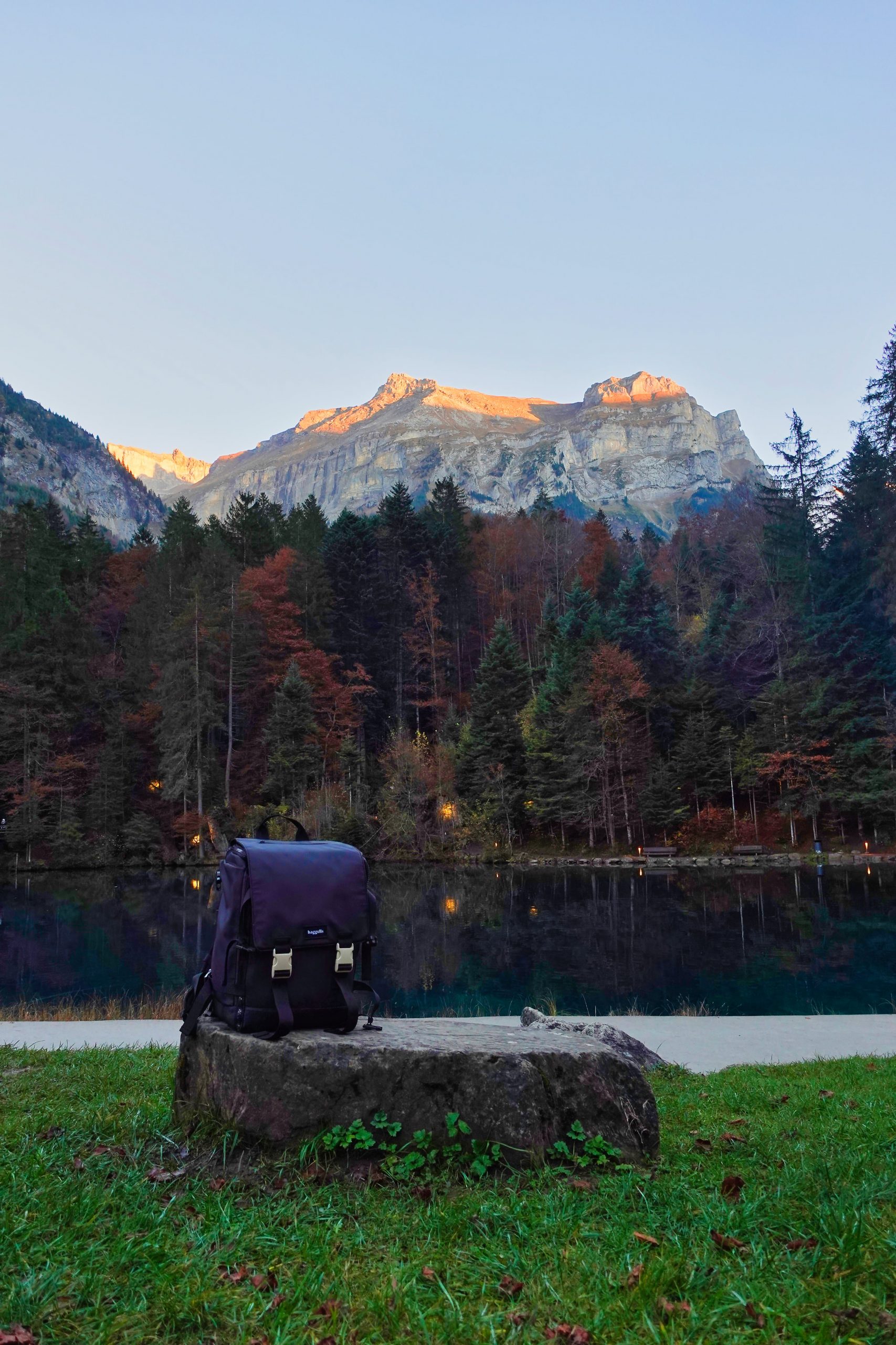 Le sac à dos Baggells face aux paysages suisses au coucher du soleil – parfait pour les escapades nature.